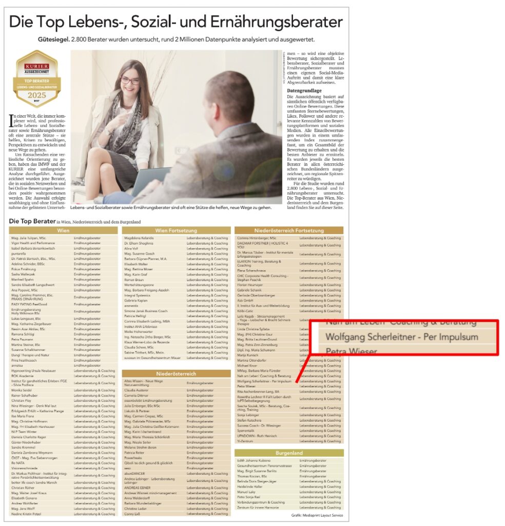 Bei dieser Studie wurden 2.800 Lebensberater (so heißt unser Gewerbeschein) analysiert und ausgewertet. Am 12. September 2025 wurden die Ergebnisse dann im Kurier veröffentlicht.